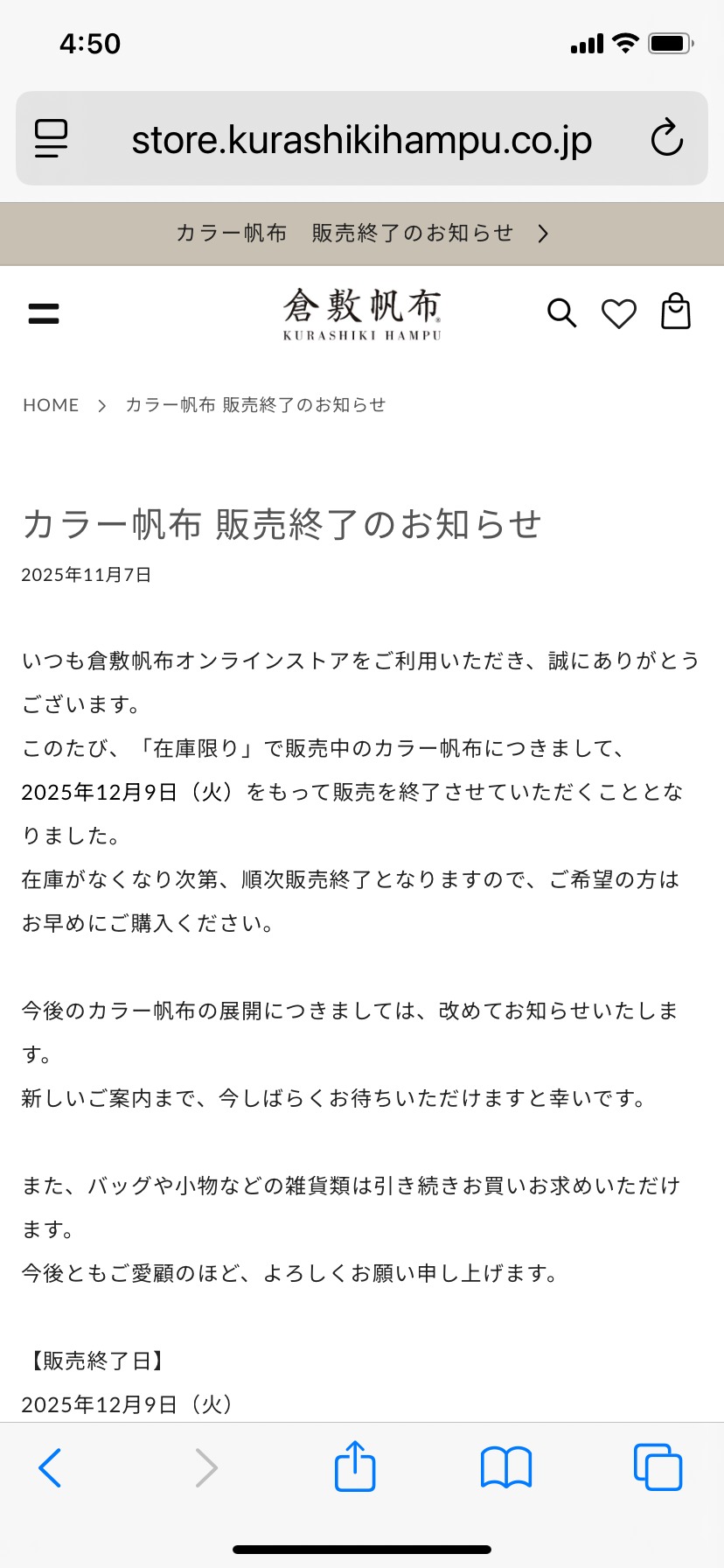 12月9日で倉敷帆布販売終了