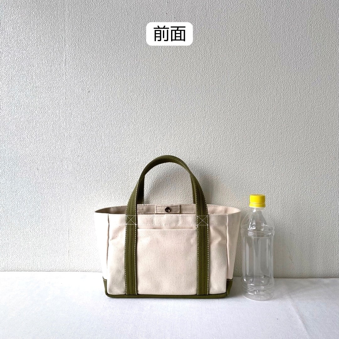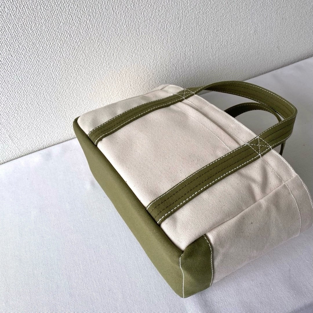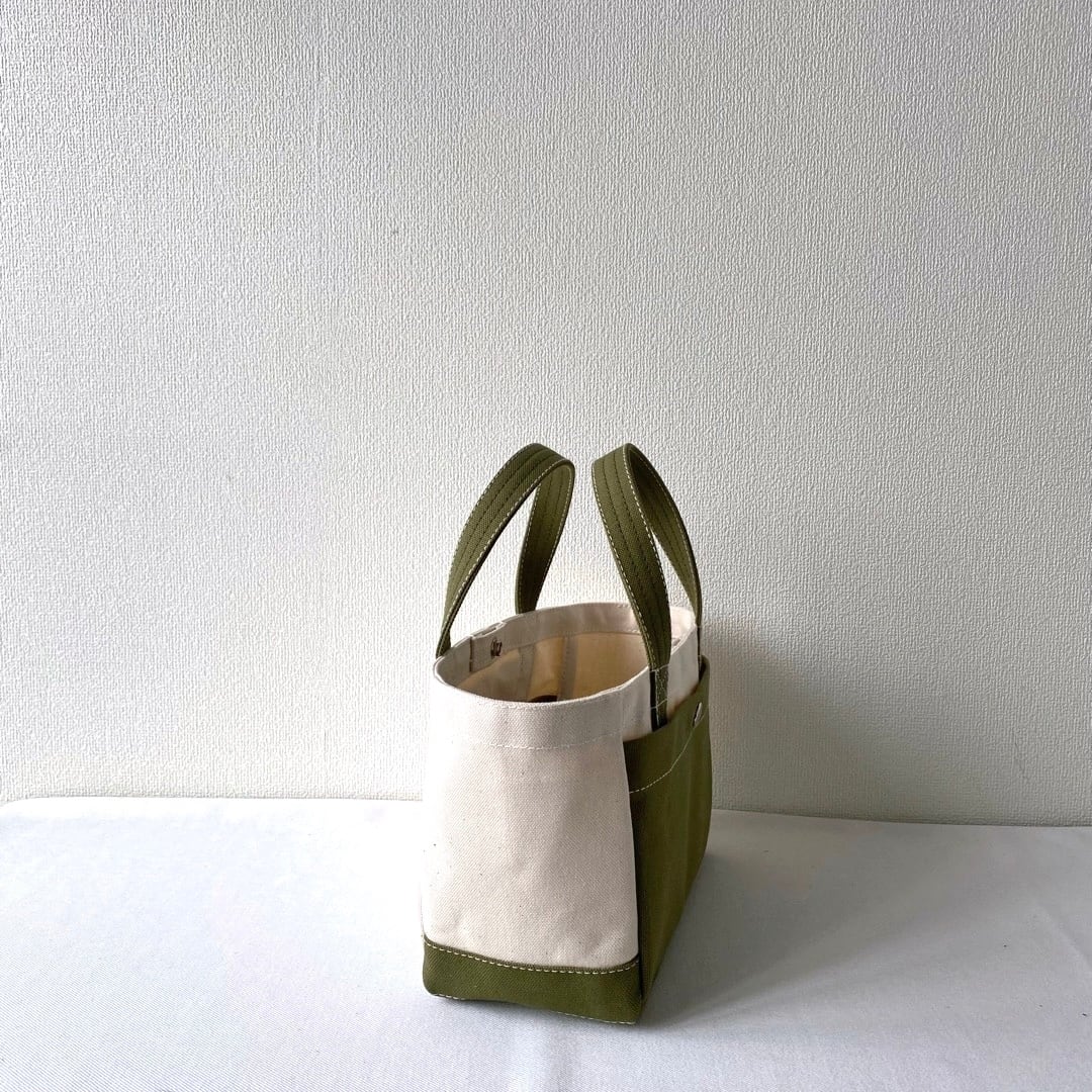 ■<サンプル品>「軽いボックストート」ミニサイズ「生成り✕モスグリーン」です。