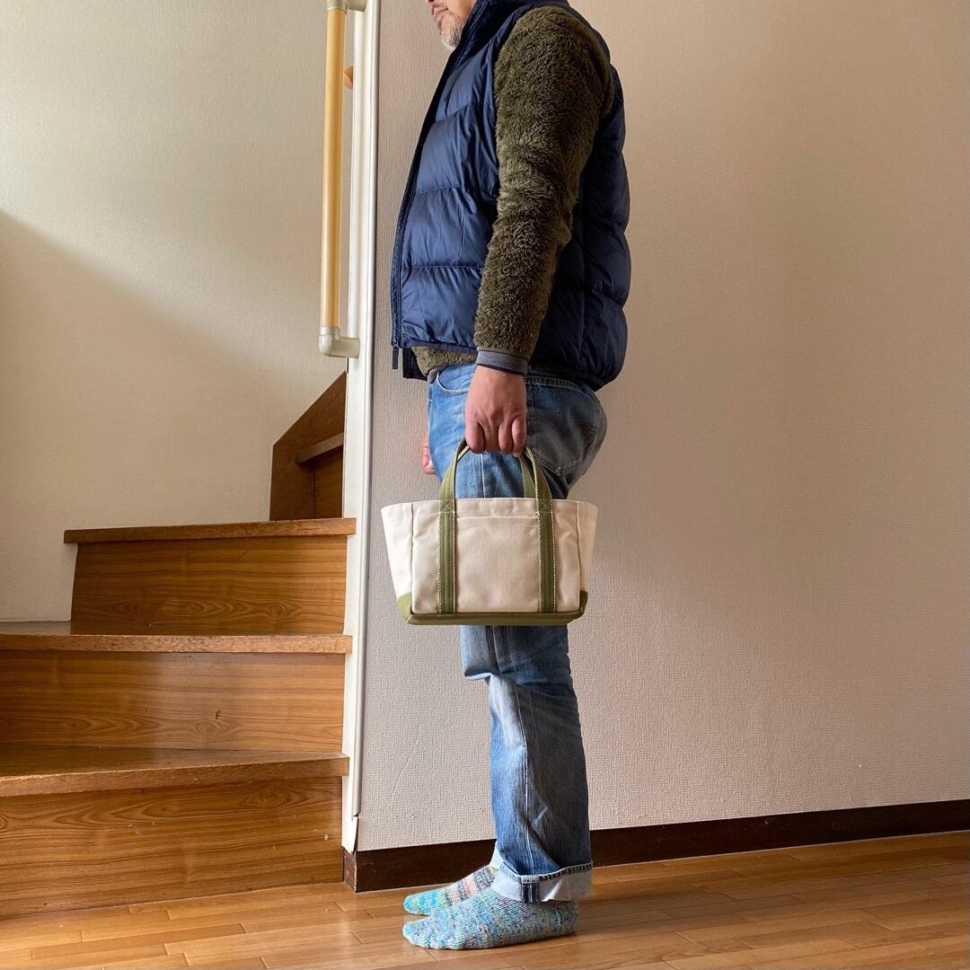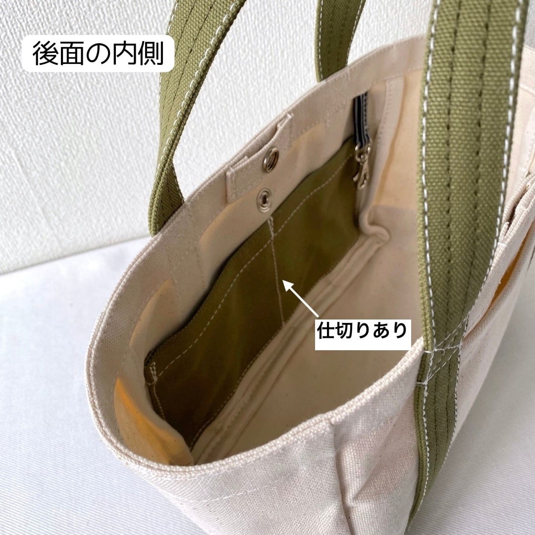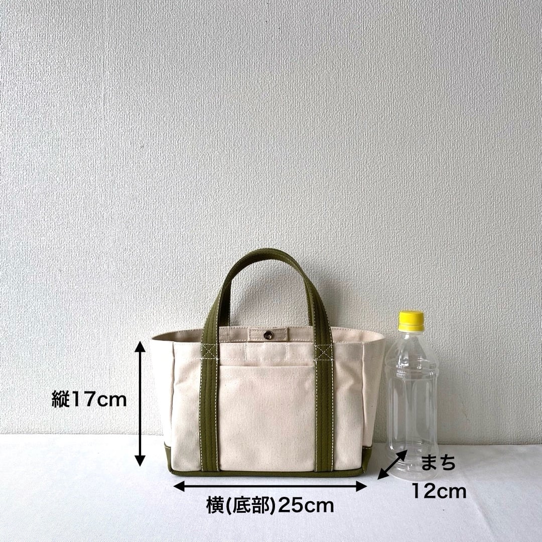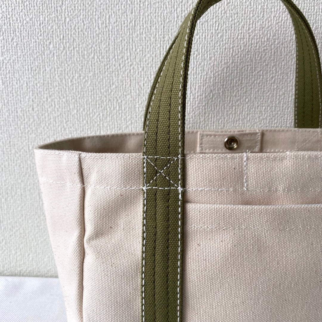 ■<サンプル品>「軽いボックストート」ミニサイズ「生成り✕モスグリーン」です。