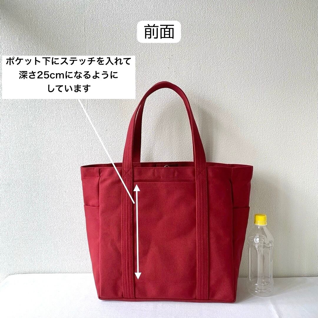 ※「混合トート」大サイズの前面外ポケットは、そのままだと深さが30cmと深くなってしまうので、ステッチを入れて深さが25cmになるように調節します。