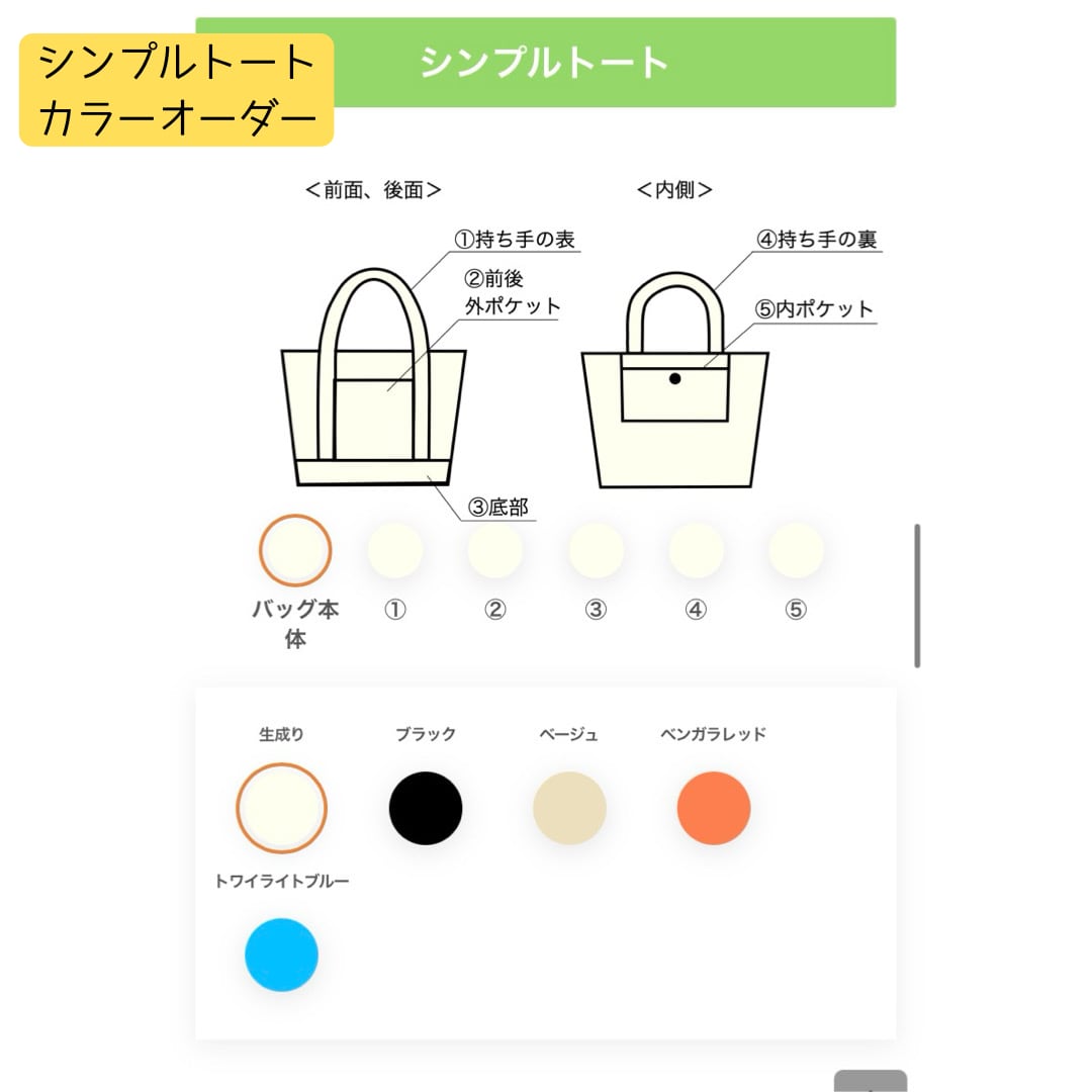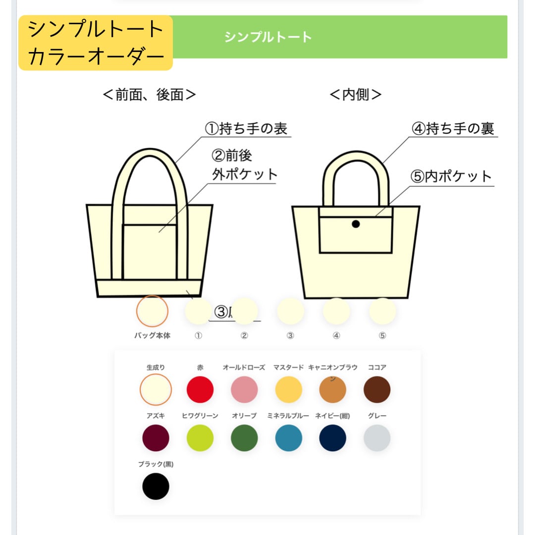 「追加料金なしで、バッグの持ち手、ポケットの色、変更出来ます」をご覧ください。